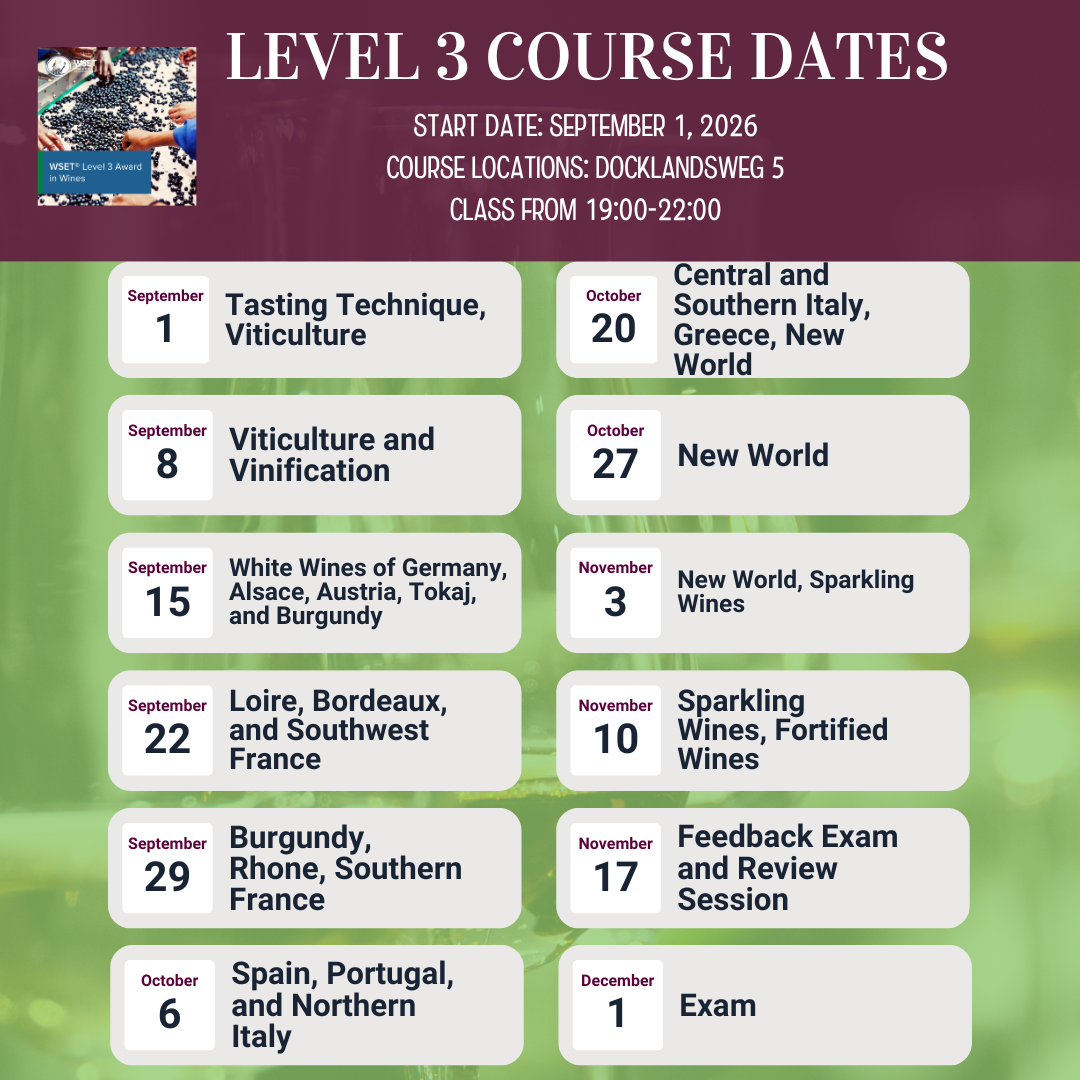 Class Sessions for all WSET Level 3 Award in Wines Courses are as follows: